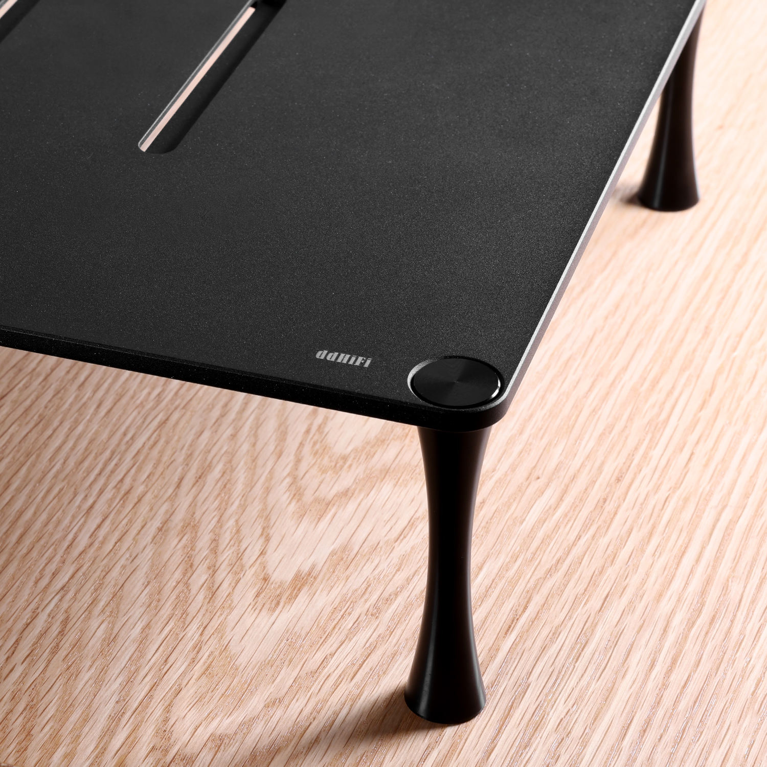 选用6063高强度航空铝材 层板底面设计有震动吸收槽,中间留有导风口 小蛮腰支撑脚设计,支撑脚底部都安装有减震硅胶