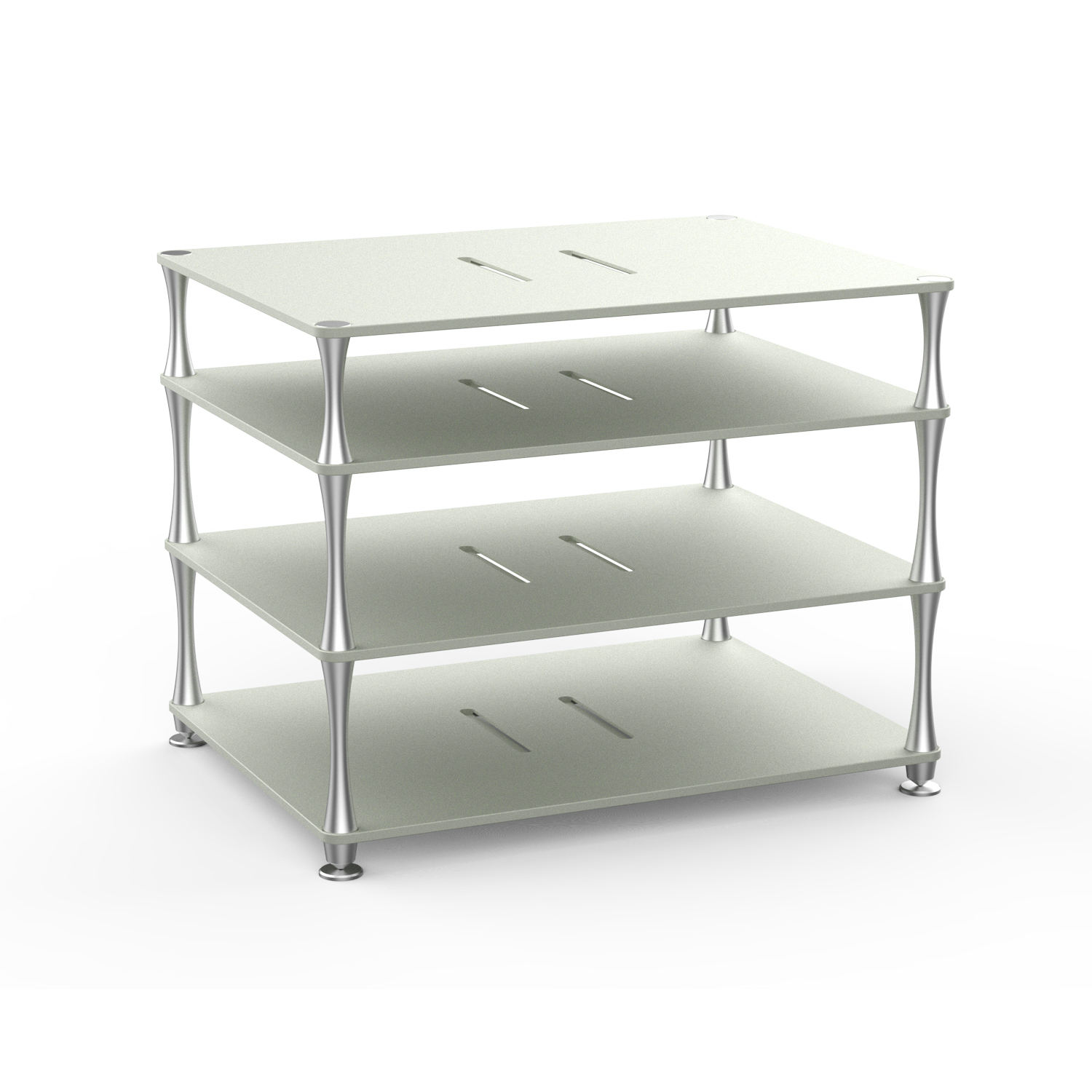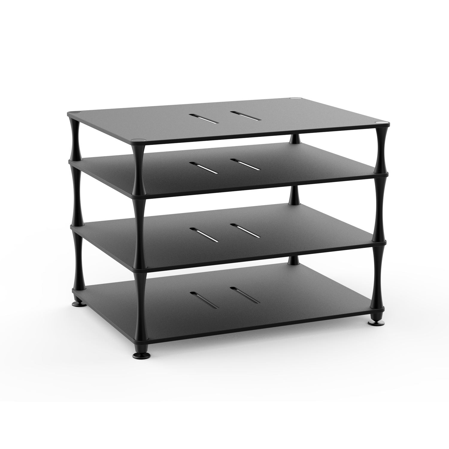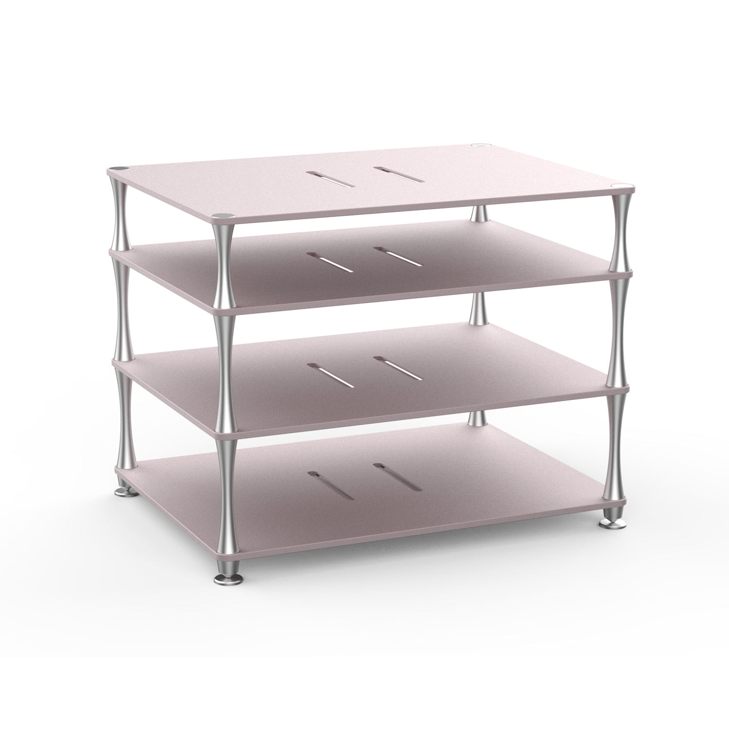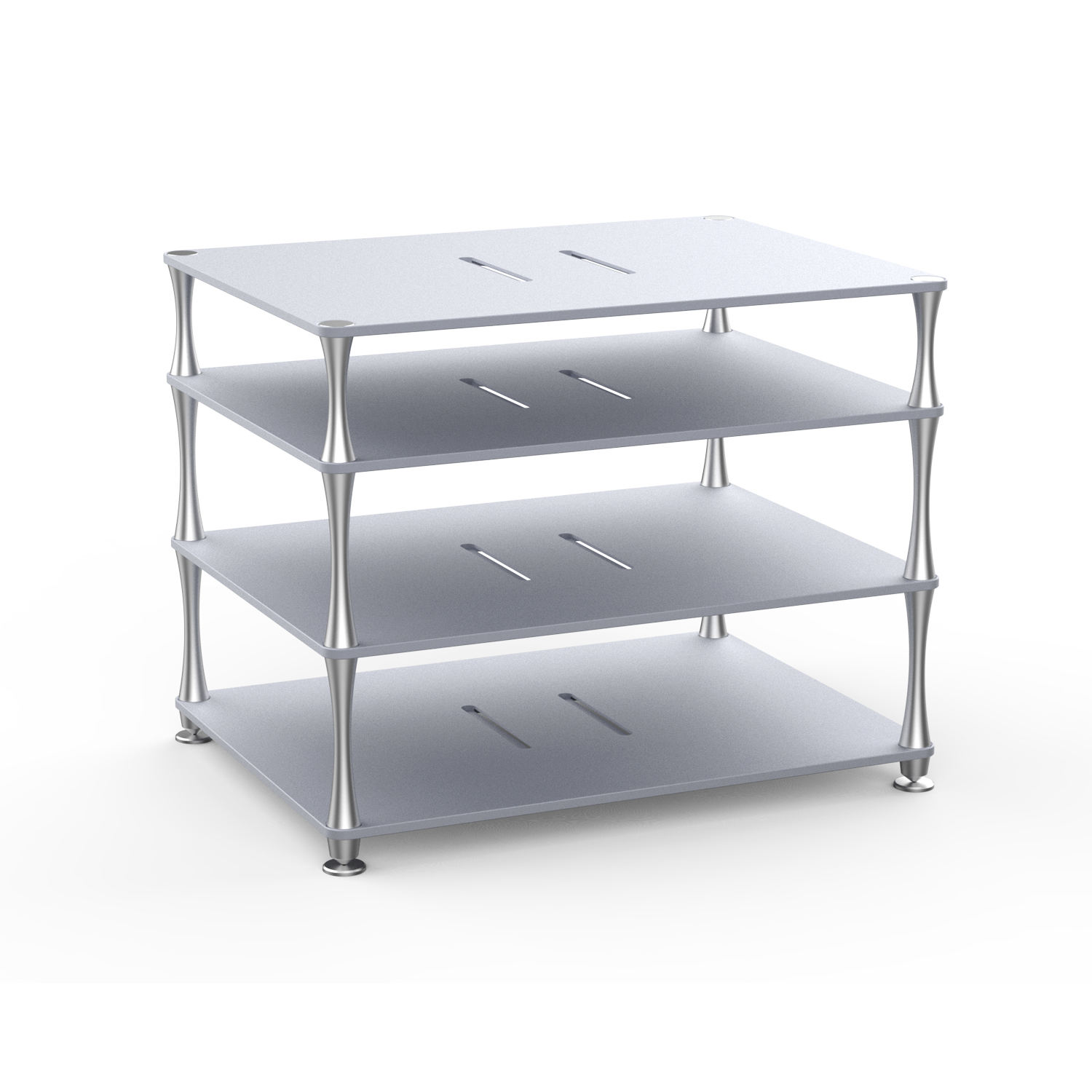 台式功放设备桌面定制支架 选用6063高强度航空铝材 层板底面设计有震动吸收槽,中间留有导风口 小蛮腰支撑脚设计,支撑脚底部都安装有减震硅胶